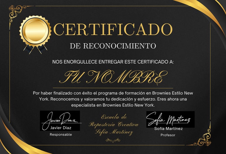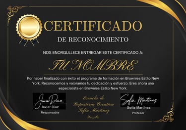 Al terminar tu lectura y práctica del curso, podrás descargar un certificado digital personalizado emitido por la Escuela de Repostería Creativa Sofía Martínez.